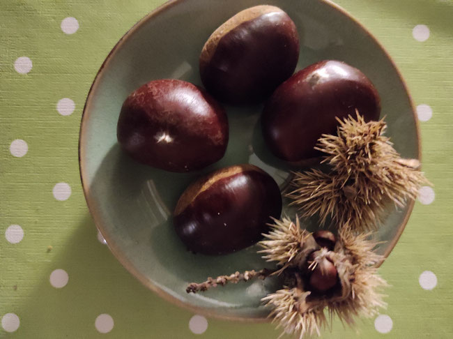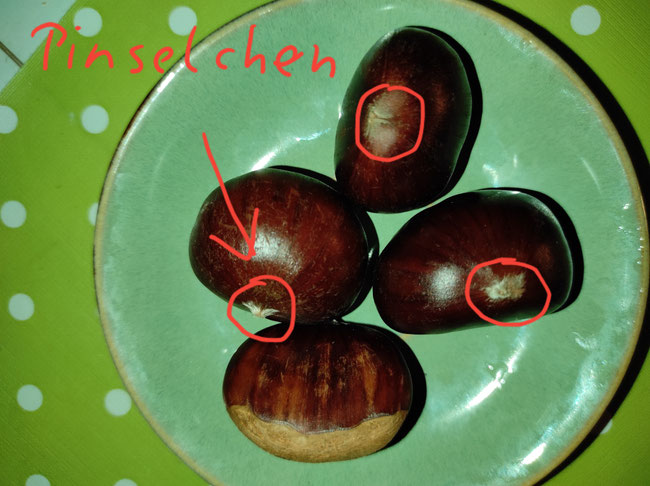 Esskastanien kann man essen, Rosskastanien nicht. Ihr dürft sie nicht verwechseln. Esskastanien haben sehr stachelige Hülsen, die richtig heftig pieksen. Das ist bei den Rosskastanien nicht so. Außerdem haben Esskastanien hinten am dunklen Popo ein winziges, spitzes Pinselchen. Rosskastanien haben einen glatten Popo.