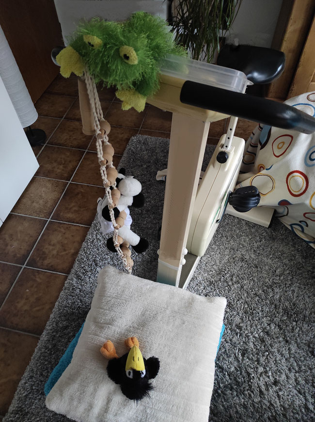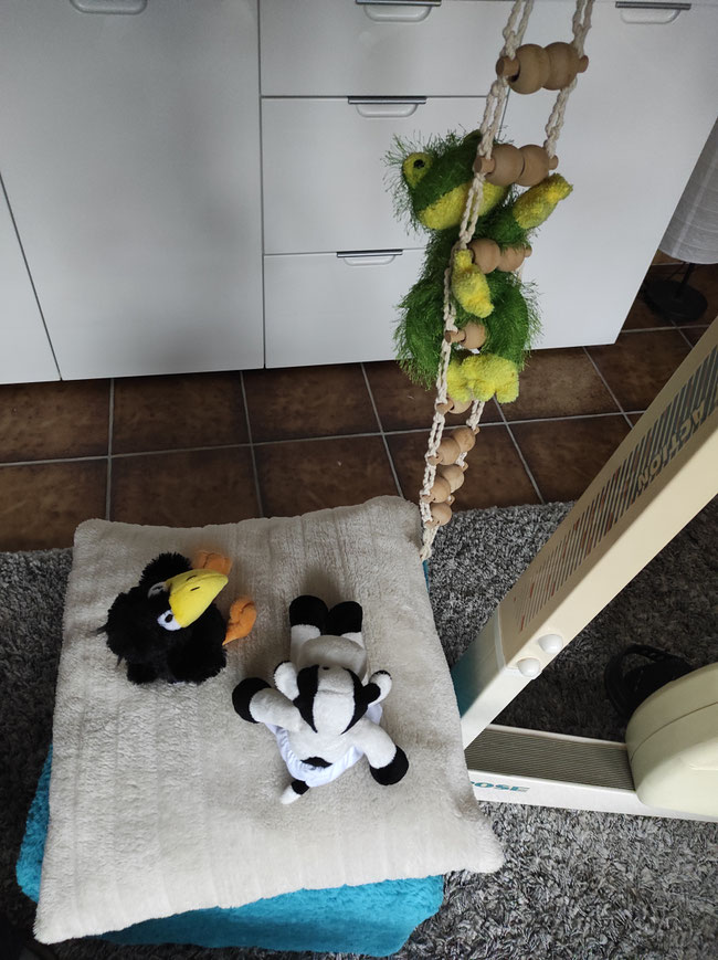 Seht mal, wir haben aus Mama Nicoles Massageroller eine Strickleiter gemacht. Gar nicht so einfach, daran hinauf zu klettern. Sie wackelt sehr!