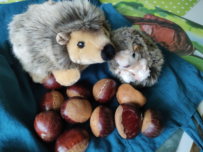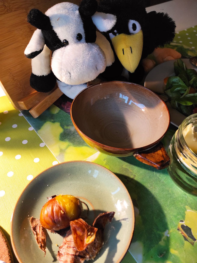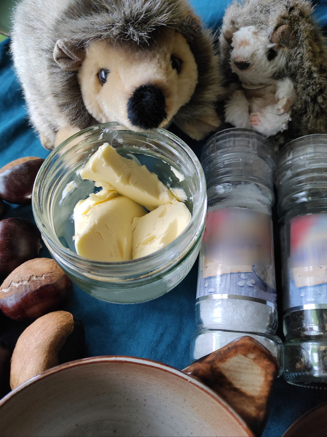 Jetzt haben wir einen Bärenhunger! Hört ihr unsere Bäuche knurren? - Gleich geht es los, unser Kastanienessen.