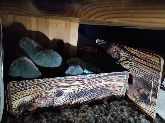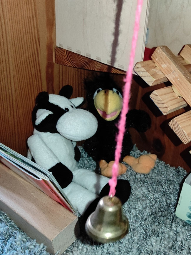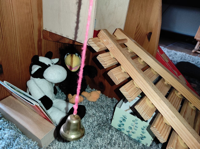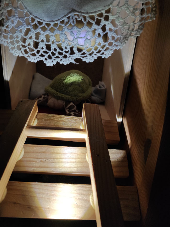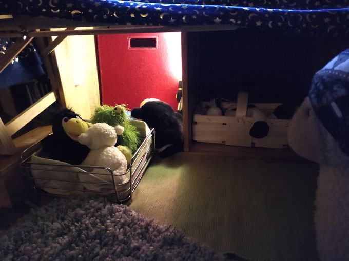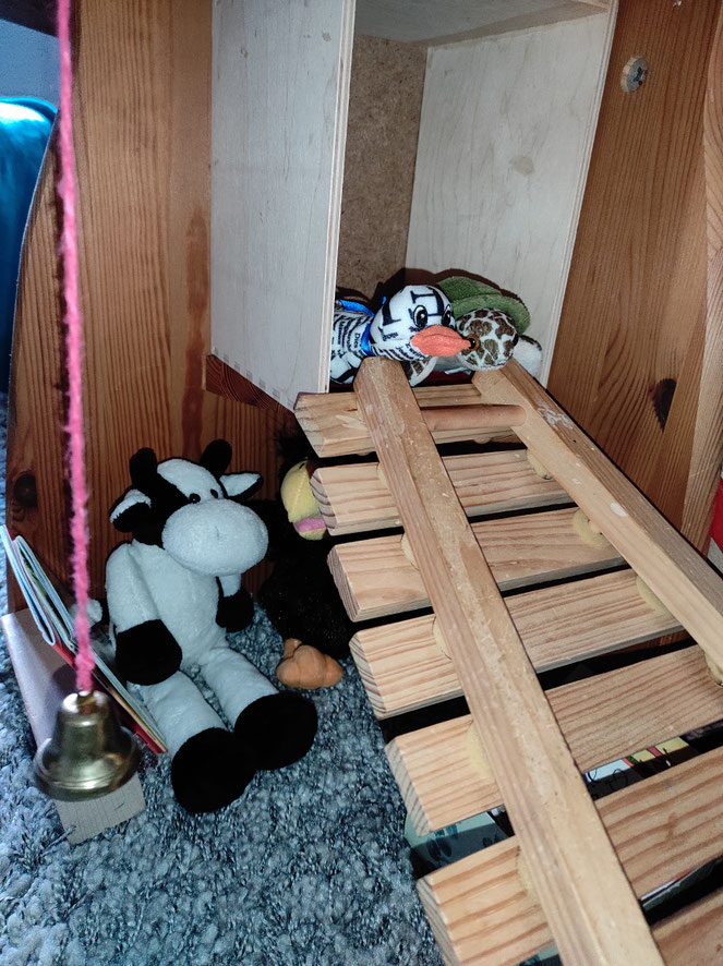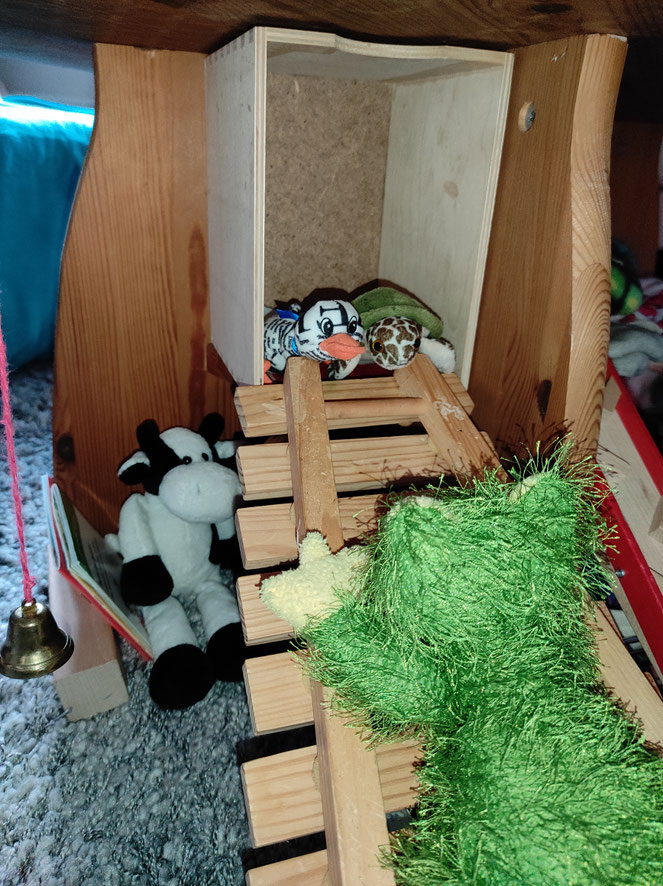 Wir hatten heute noch Lust, ein bisschen umzubauen. Es gibt eine gemütliche Ecke unter dieser Holztreppe, die zu einer Art Hochsitz führt. Man kann sogar anklingeln.