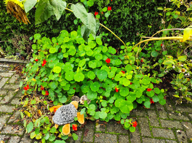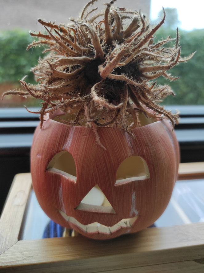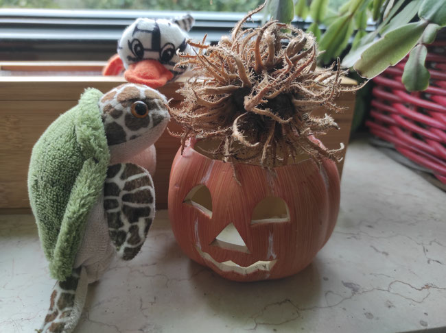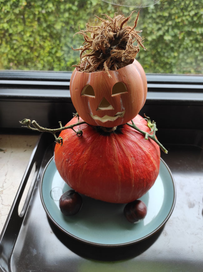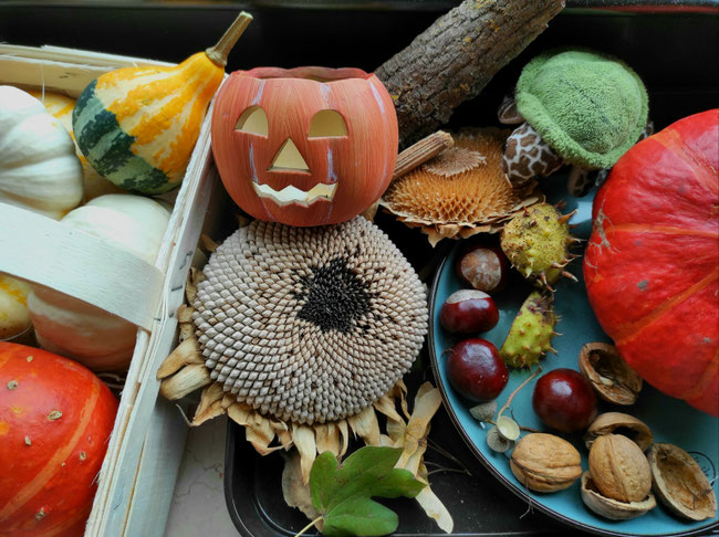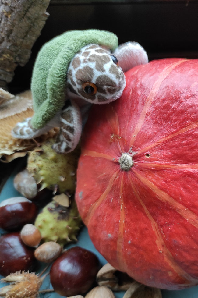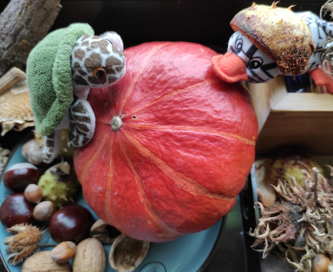 Kinder, Kinder, wie bunt ist doch der Herbst! Ich habe fleißig Gemüse, Früchte, Samen und Nüsse geerntet. Zugegeben, bei den beiden großen Kürbissen hat Odilo mir geholfen. Werft mal einen Blick auf die Fensterbank unserer Küche: