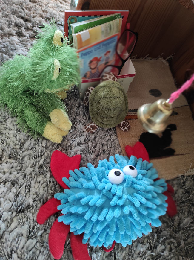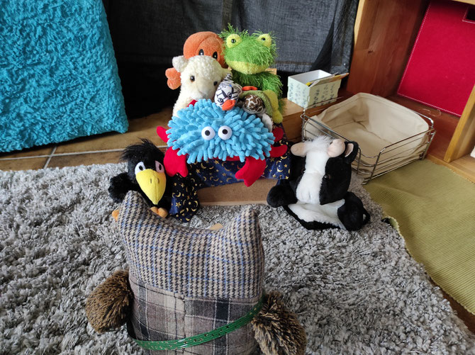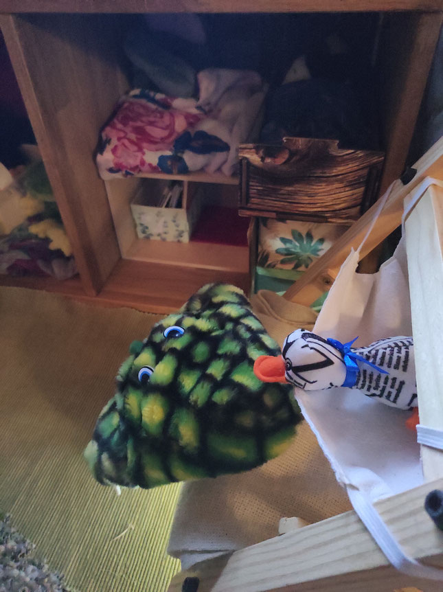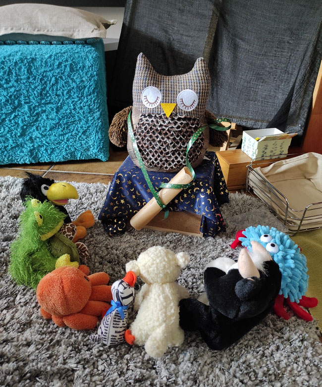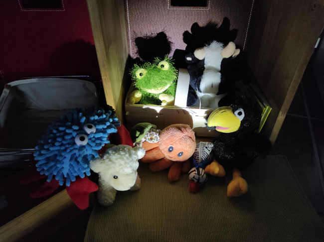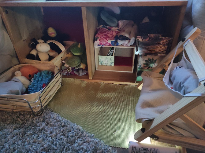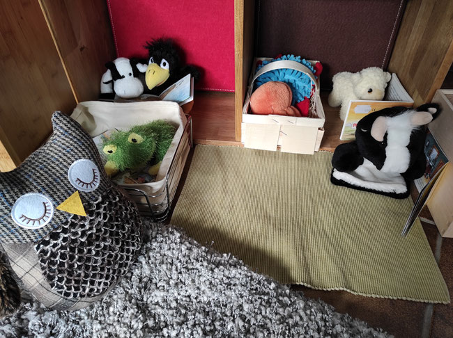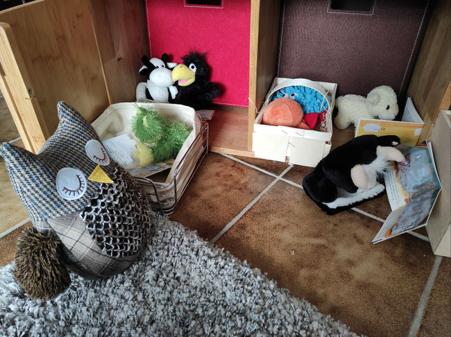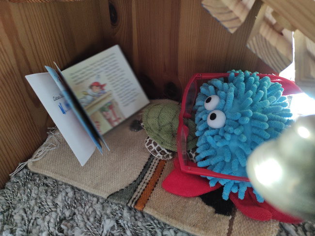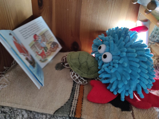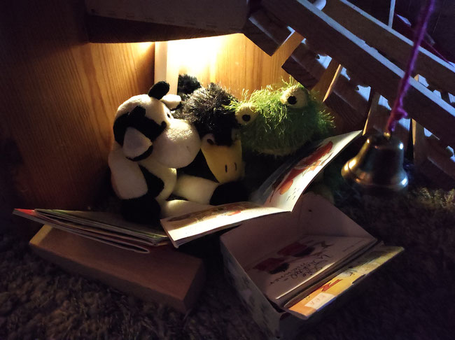 Wir haben uns gewünscht, heute abend die Gute-Nacht-Geschichten einmal selbst zu lesen. Heulia fand das okay und hat für uns gemütliche Leseecken eingerichtet. Wir durften uns Bücher aus der KuTi-Bücherei aussuchen. Azzurro vermisst seine Eltern sehr und kuschelt mit Qualli in der Kürbiskiste.