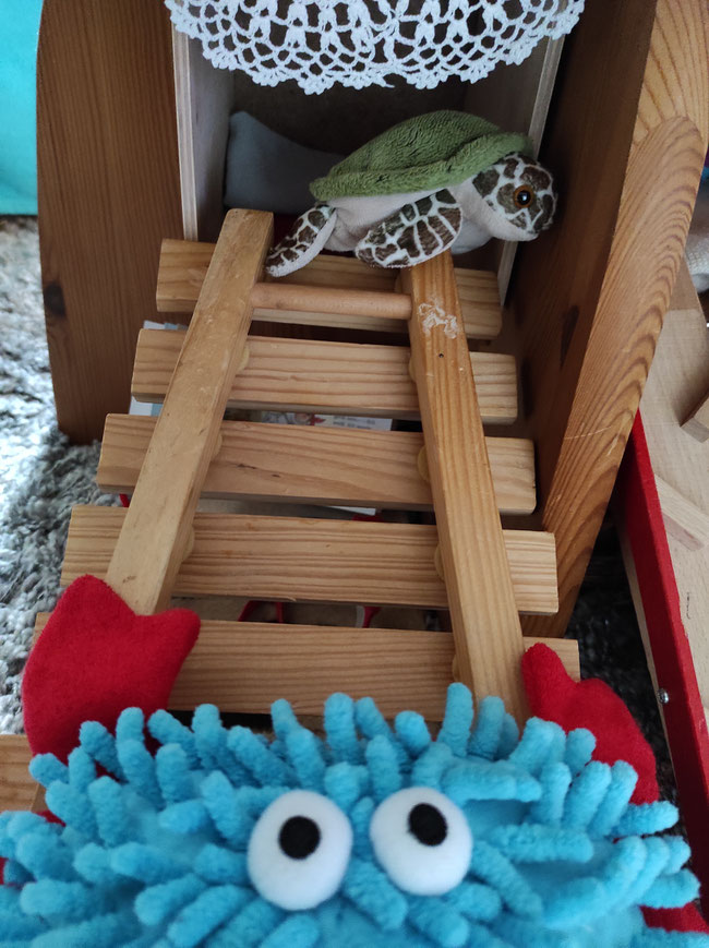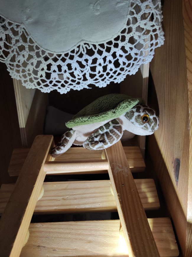 Panzerotti kann sich im Hochsitz zurückziehen, wenn er möchte. Froschi und Paula müssen noch üben, ihn auch mal in Ruhe zu lassen mit ihren vielen Ideen und Vorschlägen, hat Heulia gesagt. Panzerotti ist für eine Schildkröte sehr flott und sehr viel unterwegs. Aber jede Schildkröte sollte irgendwann einmal chillen und neue Kräfte sammeln. Wir natürlich auch.