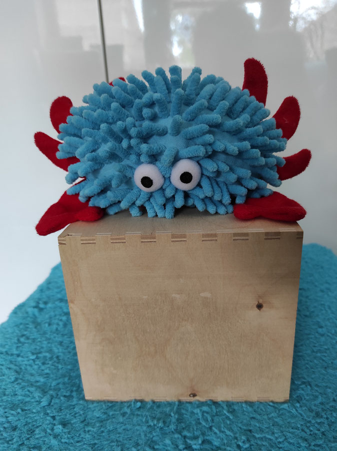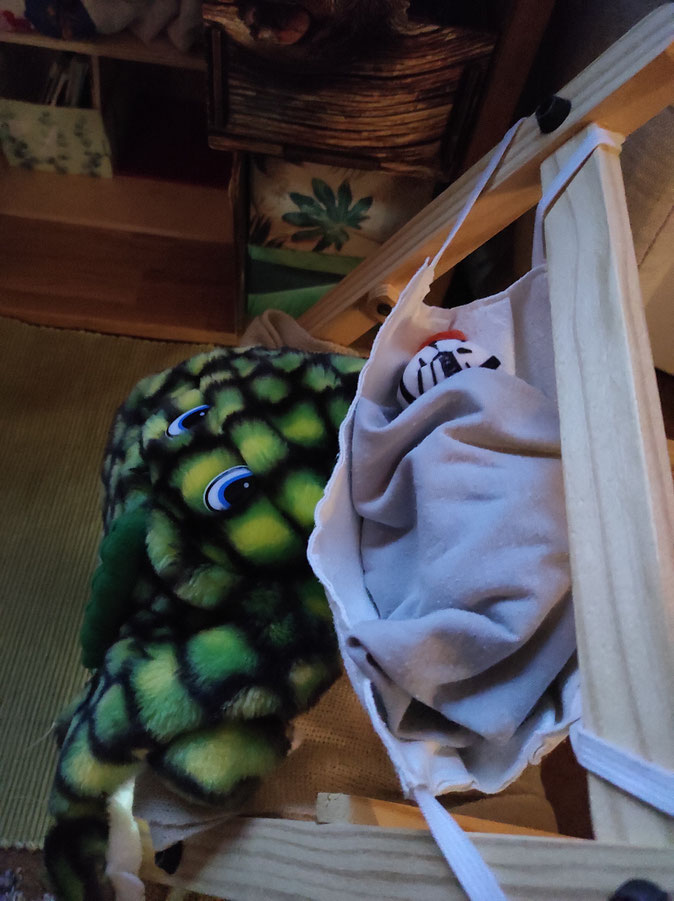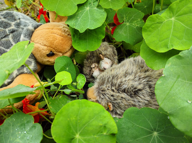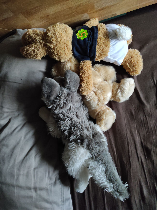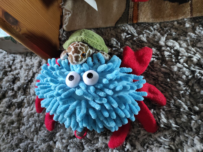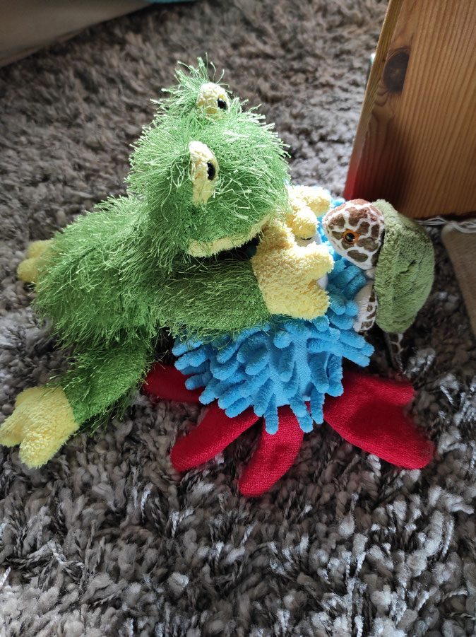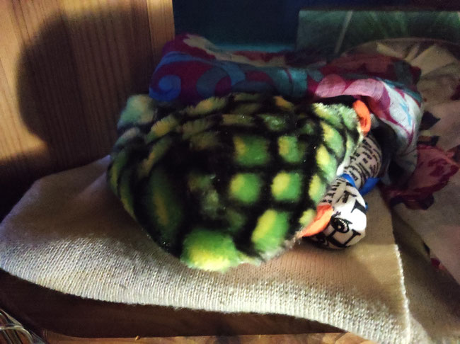 Paula und Froschi haben sich für den Teich entschieden. Nach dem Schwimmen war Paula so müde, dass sie sich mit Odilo sofort gemütlich eingemummelt hat.
