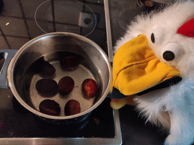 Hilde kocht in der Zeit unsere Esskastanien. Diese hier sind besonders groß. Sie haben schon 12 Minuten gekocht und sind bald fertig.