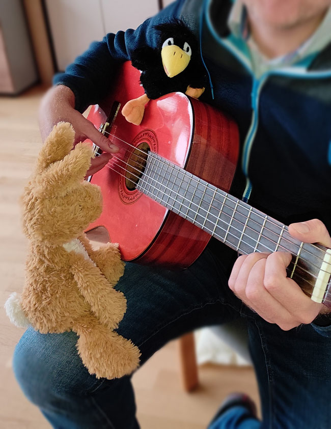 Außerdem durften wir Schlaggitarre spielen. Was? - Nein, dabei schlägt man nicht das Instrument kaputt! Man wischt mit der einen Pfote (oder dem Flügel) am Loch über die Seiten. Mit der anderen Pfote (oder dem anderen Flügel) greift man Muster auf den Saiten, oben auf dem Gitarrenhals. So klingen gleichzeitig mehrere Töne passend zum Lied. Das klingt sehr schön, wenn man es kann. Der Gitarrenlehrer hat zum Schluss sogar mit uns den KuTi-Song gesungen und begleitet.