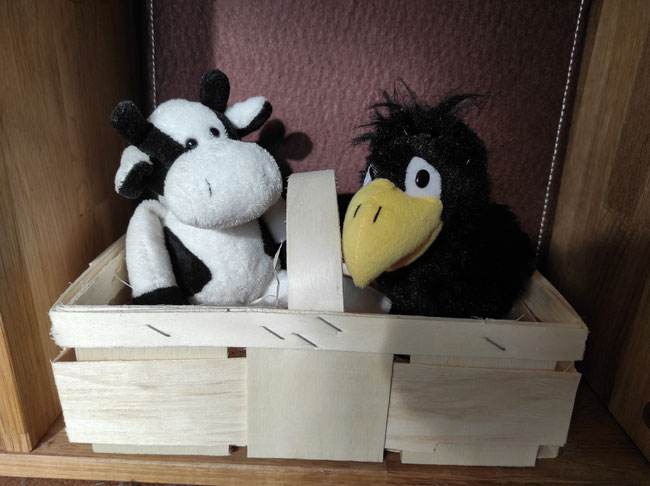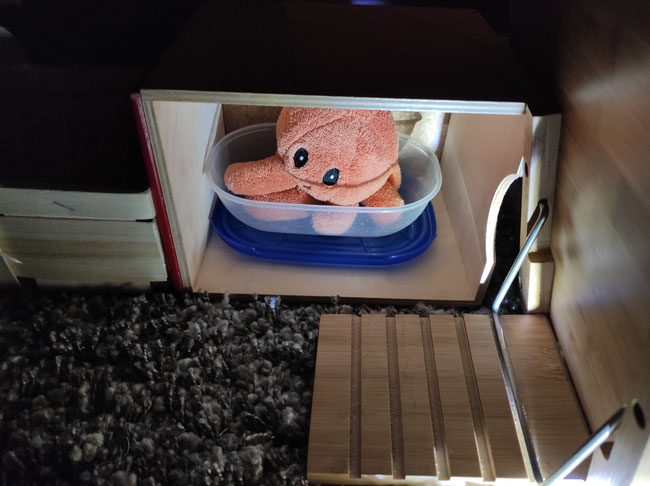 Willi ist schon müde. Er ist gewohnt, in einem richtigen Stall zu schlafen. Deswegen haben wir als Bett für ihn die Kürbiskiste mit Stroh ausgesucht. Qualli schläft ja in der Badewanne.