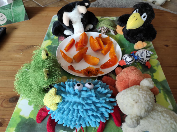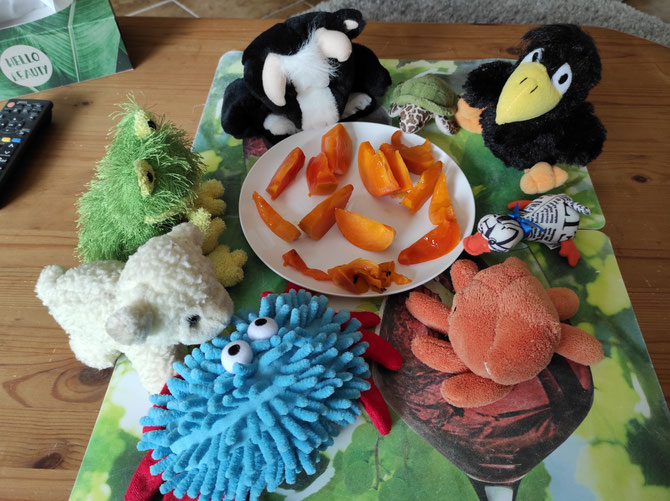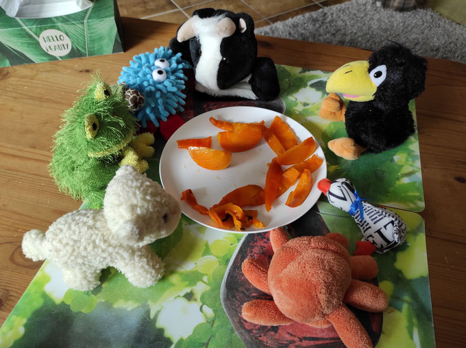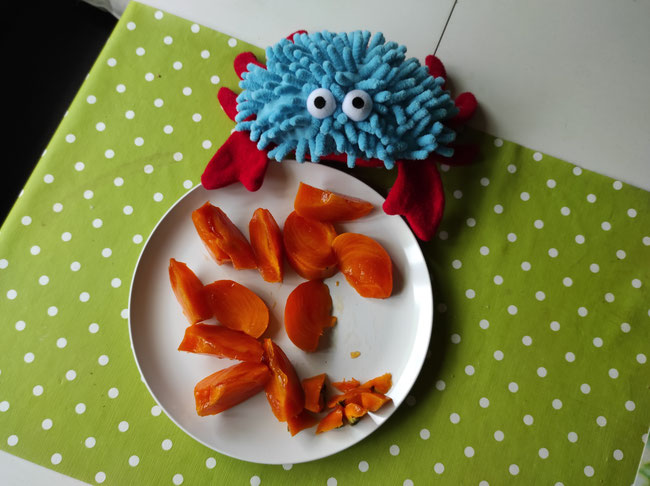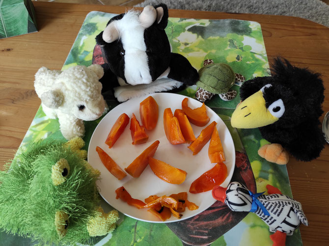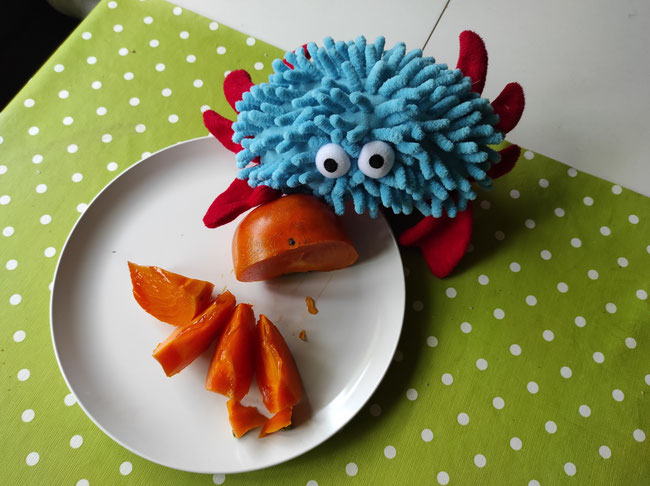 Interessant, keiner von meinen KuTis kennt diese Frucht, und niemand traut sich sie anzurühren. Ich schneide sie nun in der Küche mit meinen Scheren in kleine Sicheln. - Was Sicheln sind? Der Mond ist auch manchmal eine Sichel: 🌙