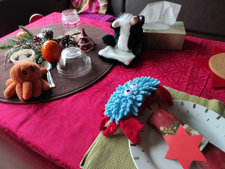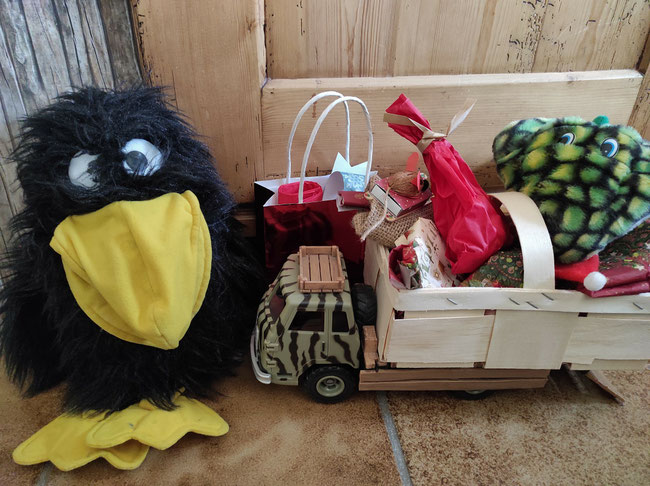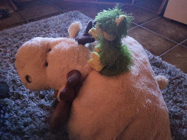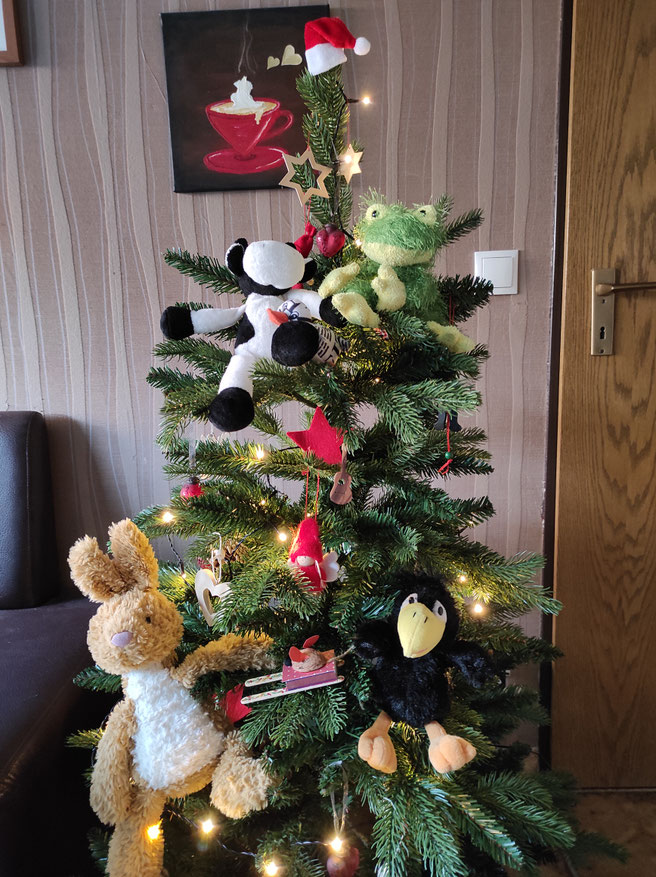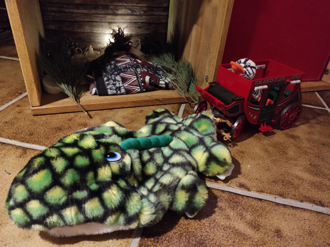 Ich habe mich bereit erklärt, mich auf dem Weihnachtsmarkt jeden Tag 1 Stunde als Baby in die Krippe zu legen. Ich wollte gerne FRIEDA und TONI als Eltern dabei haben. Also spielt Frieda nun die Maria und Toni den Josef. Und wenn wir mal pinkeln müssen, springen Froschi, Elli und Paula für uns ein.