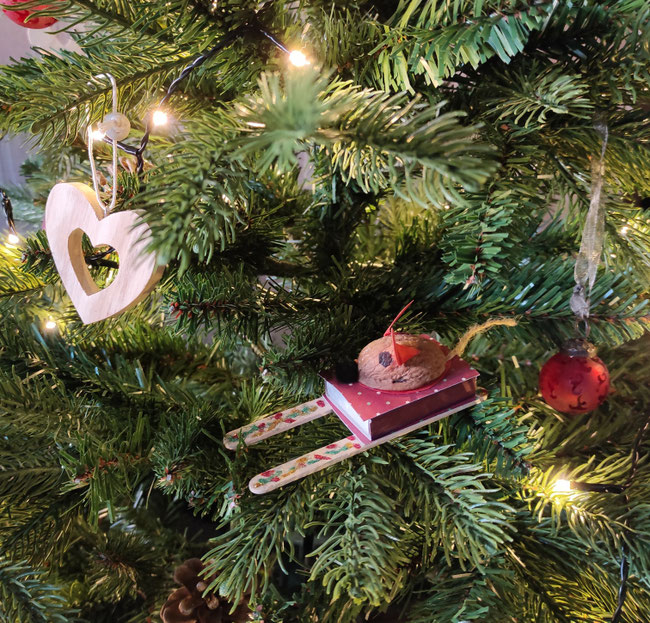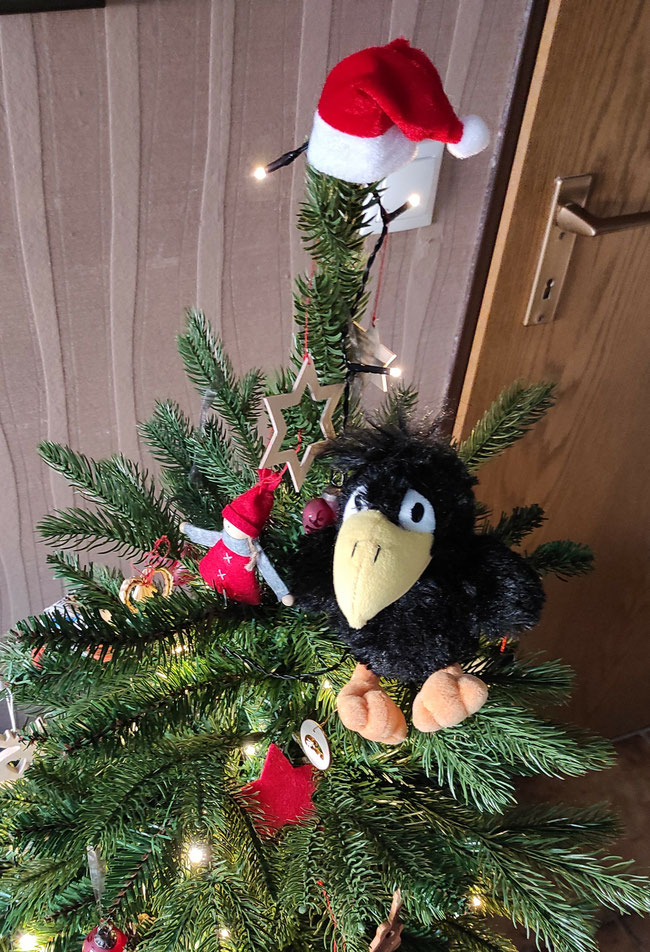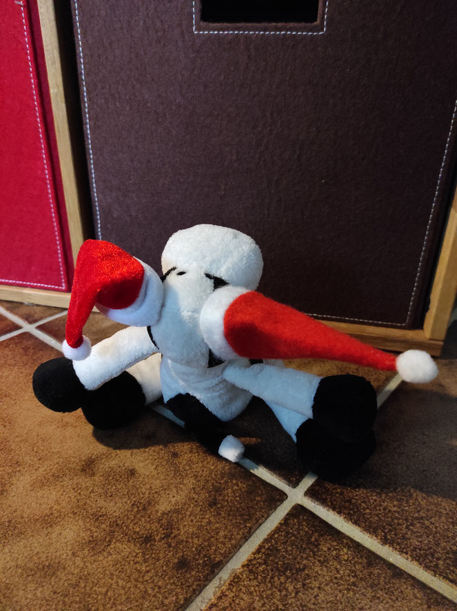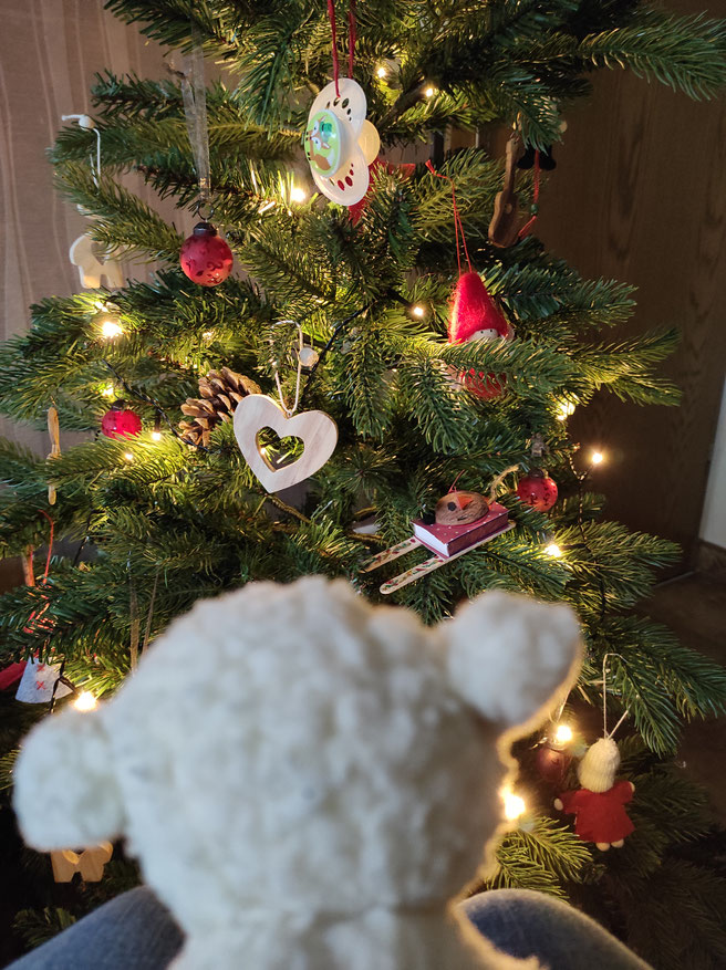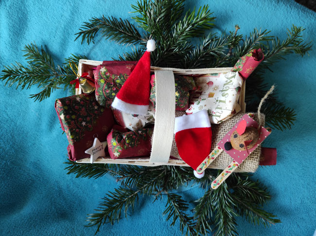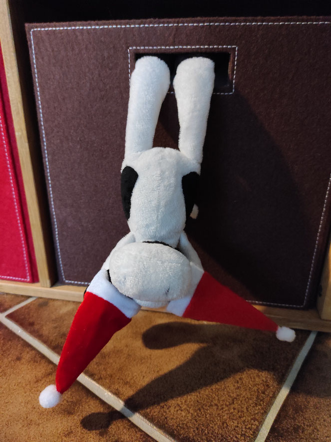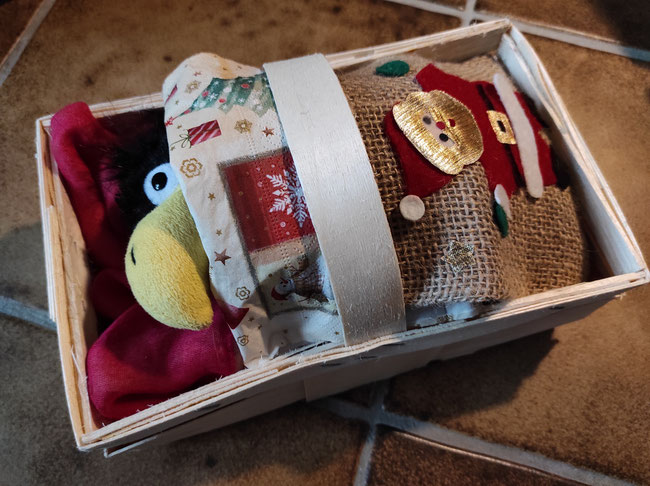Ich habe mir eine Apfelsinenkiste als Bettchen gewünscht und eine schöne Weihnachtsbettwäsche dazu. Mein Wunsch ist in Erfüllung gegangen. Ich liebe diese kleinen Kisten, sie sind so herrlich eng, fast wie das alte Ei, aus dem ich geschlüpft bin. Deswegen schlafe ich besonders gut. Ich mummle mich jetzt ein.