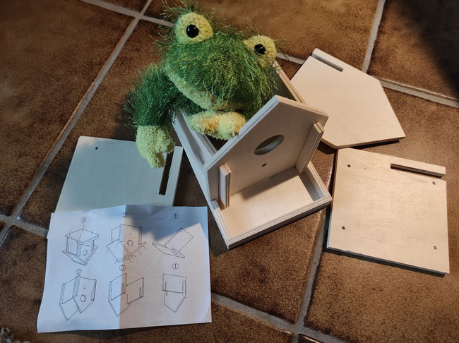 Ha! Hättet ihr gedacht, dass ich mal selber ein Haus baue, Kinder? Dieses hier ist für die Wildvögel: Meisen oder Rotkehlchen zum Beispiel. Sie können in diesem Haus aus Naturholz nisten und ihre Kinderchen bekommen. Für die großen Amseln ist das Loch wahrscheinlich zu klein.