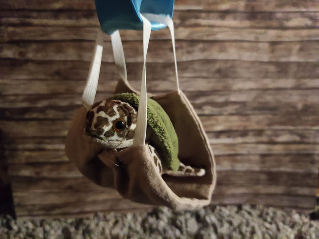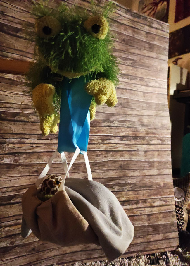 Seht mal meine neue Hängemaske! Darin schlafe ich heute Nacht. Froschi, wirf mir mal die Decke herunter!