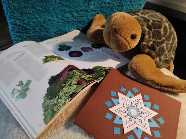 ich freue mich über mein Weihnachtsgeschenk! Seht euch dieses Buch an: Es zeigt Bilder von allen Salaten, Kohlgemüsen und Blattgemüsen, die es in unserer Gegend gibt.