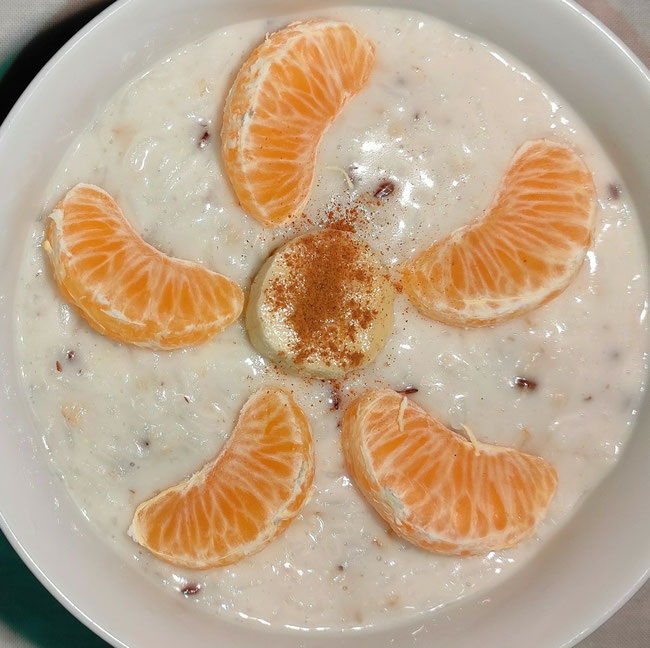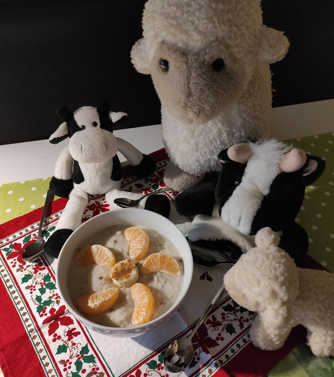 Heute gibt es das Lieblingsfrühstück aller kleinen Schafe, Ziegen und Kühe - Milchreis! Ich habe sogar Schafs- und Kuhmilch gemischt, damit für jeden von uns heute das Beste darin ist! Besonders gern mögen sie es, wenn ich außer dem Zucker eine Prise Salz, einen großen Löffel Haferflocken und einen Teelöffel geschrotenen Leinsamen beim Kochen dazu gebe.