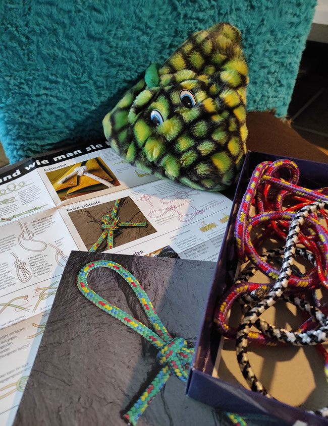 Ihr wisst doch, ich bin hier zuständig für unsere Sicherheit auf dem Hof. Ich liebe meinen Job! Bei meinem Wachgang stelle ich auch fest, was kaputt ist. Gute Taue kann ich immer gebrauchen. Aber genauso wichtig sind die richtigen Knoten. Es gibt sehr viele verschiedene Knoten. Jeder erfüllt eine andere Aufgabe. Ich übe jetzt mit diesen reißfesten Tauen und meinem neuen Knoten-Buch. Die vielen Bilder darin helfen mir sehr.