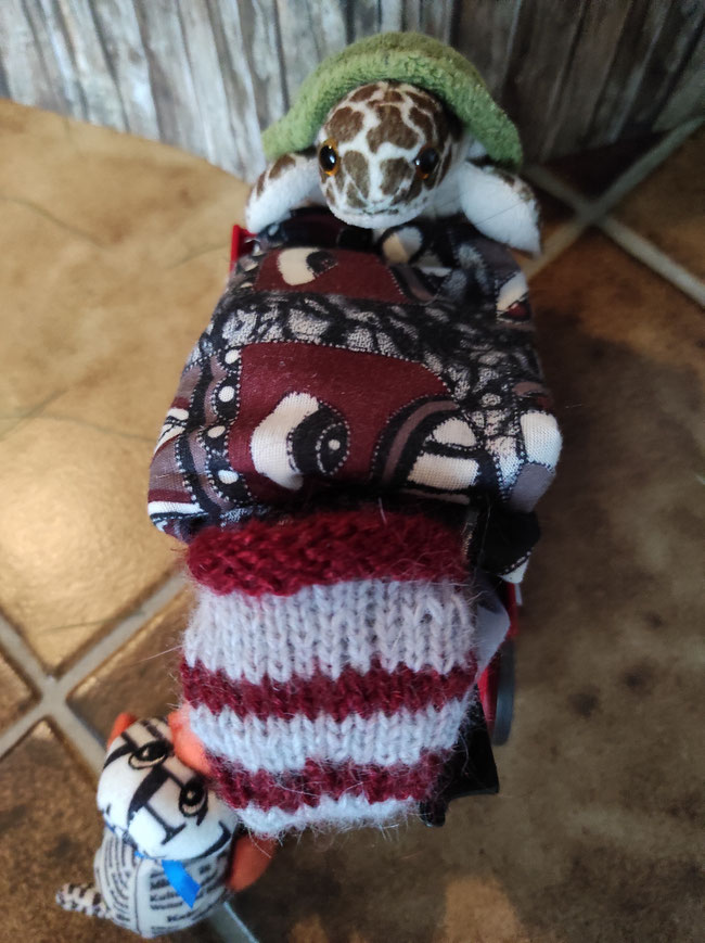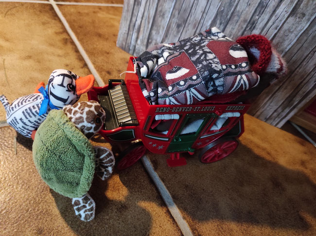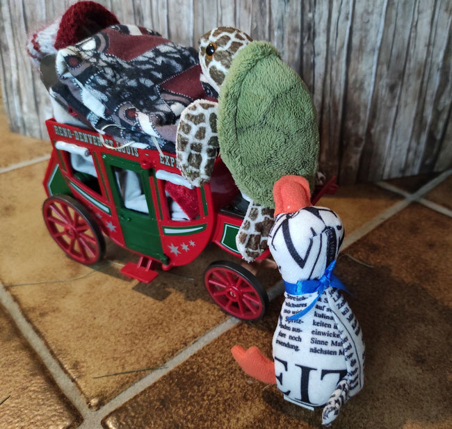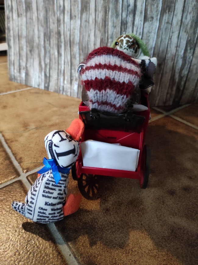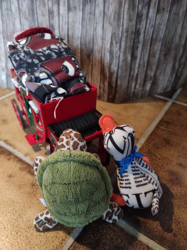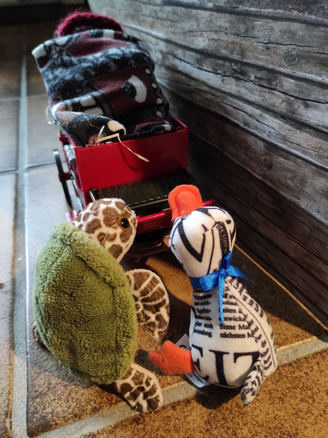 Seht mal, meine Flitze-Kutsche ist auch ein prima Kinderwagen! Panzerotti meinte, wir könnten sie ja auch langsam schieben. Dann kriegt das Weihnachtsbaby etwas Neues zu sehen, und ihm wird nicht so langweilig.