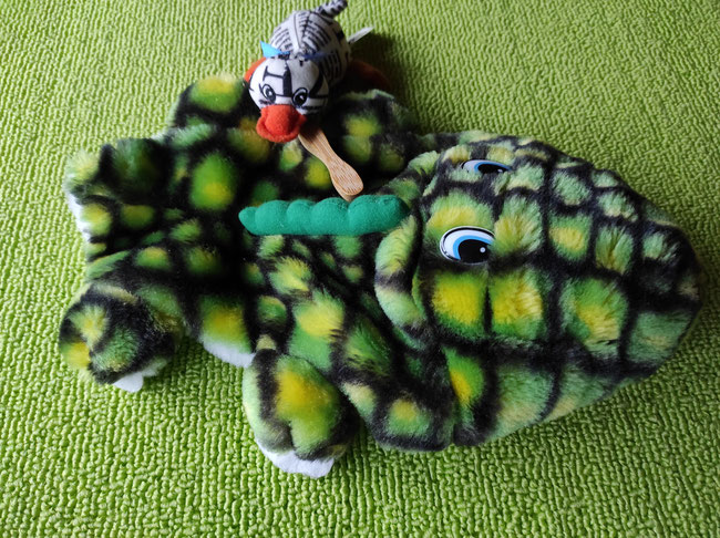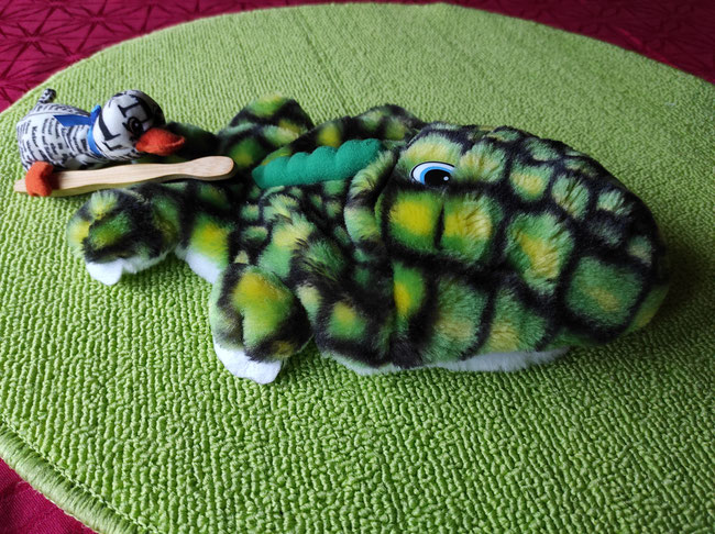 Panzerotti leiht mir gerade seinen Besen. Das freut mich sehr! Ich möchte damit nämlich meinen lieben Odilo verwöhnen! Auch Krokodile brauchen Streicheleinheiten. Und für eine kleine Ente wie mich ist so ein schöner Besen eine tolle Hilfe dafür.