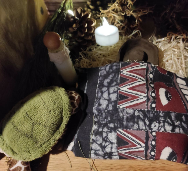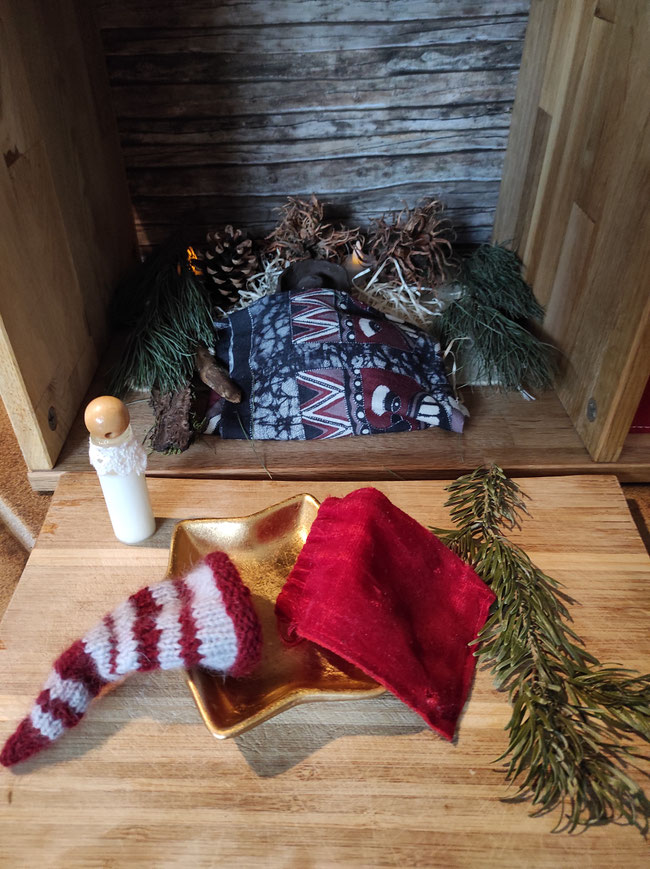 Die heilige Königin Elli hat dem Kind eine kleine Mütze gebracht. Die hat unsere Meggie gestrickt.