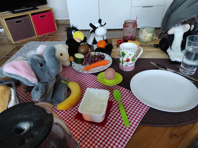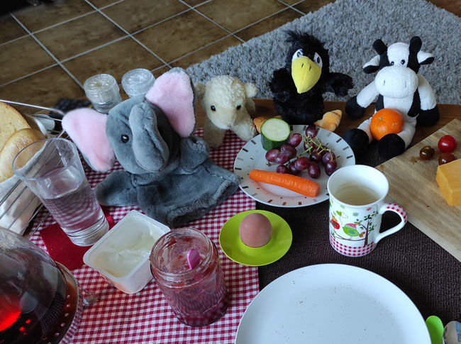 Wir haben gerade für Mama Nicole ein Sonntagsfrühstück zubereitet. Dazu hatten wir einfach mal große Lust! Unsere Brötchen sind ofenfrisch und das Ei hat Hilde heute früh persönlich gelegt! In der Marmelade sind übrigens die superreifen Erdbeeren von unserem Feld. Frieda hat den Kaffee ganz alleine gekocht und Willi die Möhre mit einem Sparschäler geschält. Zum Nachtisch gibt es gleich Früchtequark.