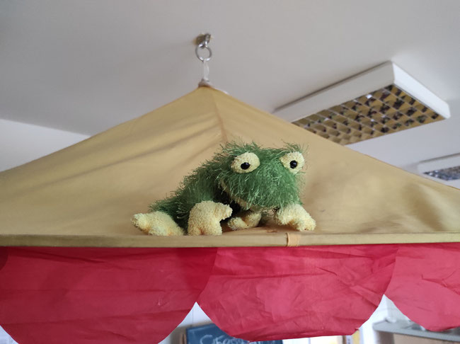 In der Schul-Bücherei schaukele ich auf dem großen Baldachin! Huijui!
