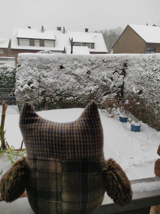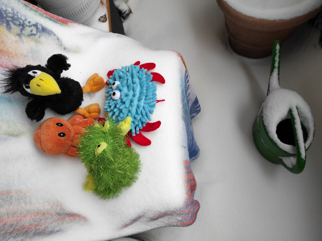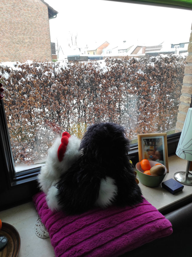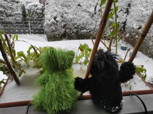 Ist das nicht ein herrlich verschneiter Morgen? Seht mal, auf unserem KuTi-Balkon ist alles weiß bedeckt. Wir beide, Qualli und Azzurro, sitzen zum ersten Mal in unserem Leben im Schnee. Brr, brrr, ganz schön kalt!