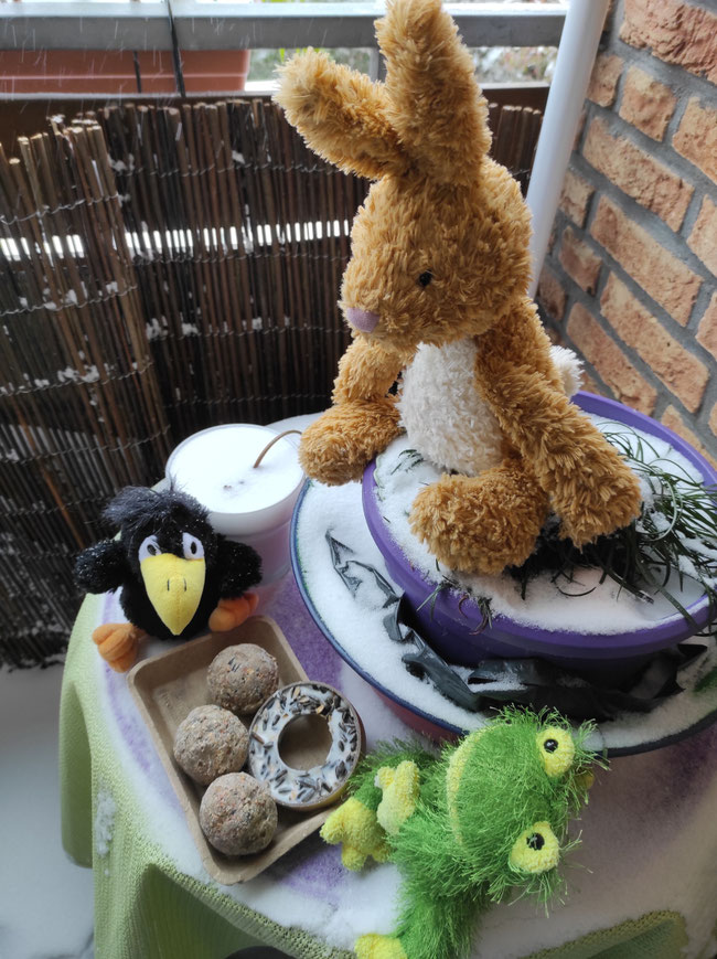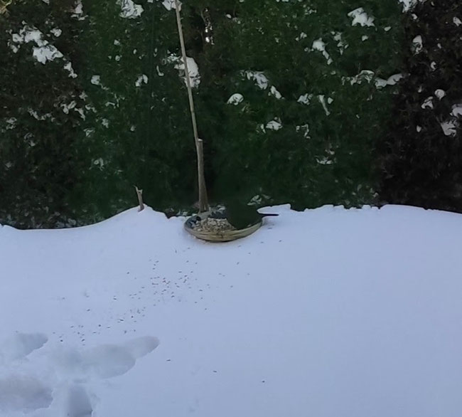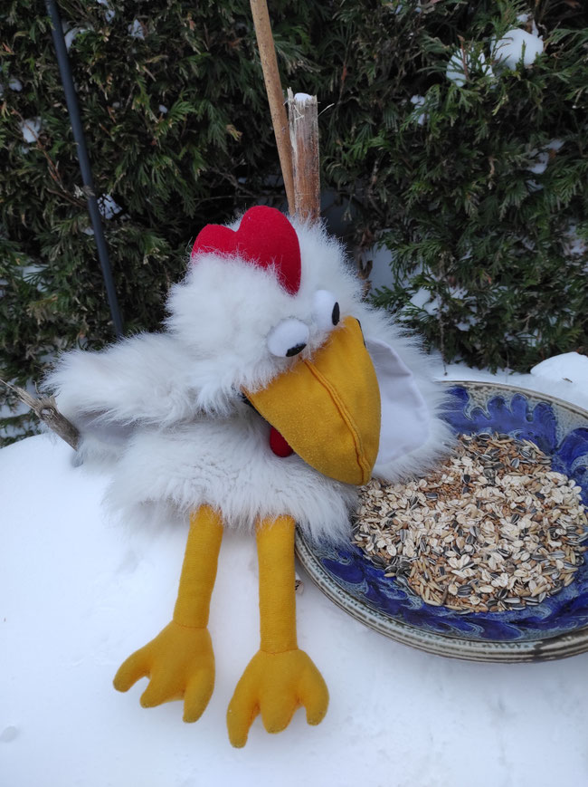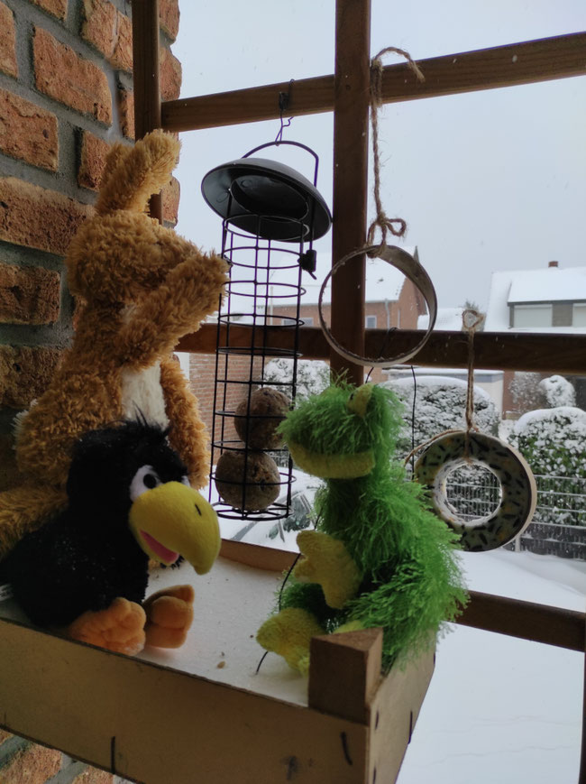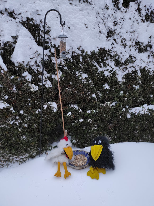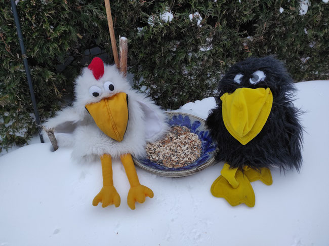 Wir haben nun eine sehr wichtige Aufgabe zu erledigen. Die heimischen Vögel brauchen unsere Nachbarschafts-Hilfe. Wie ihr seht, ist weit und breit die Erde mit einer dicken Schneeschicht bedeckt. Viele Vögel finden deswegen kein Futter. Wir wollen ihnen daher im Hof verschiedene Sorten Futter anbieten.
