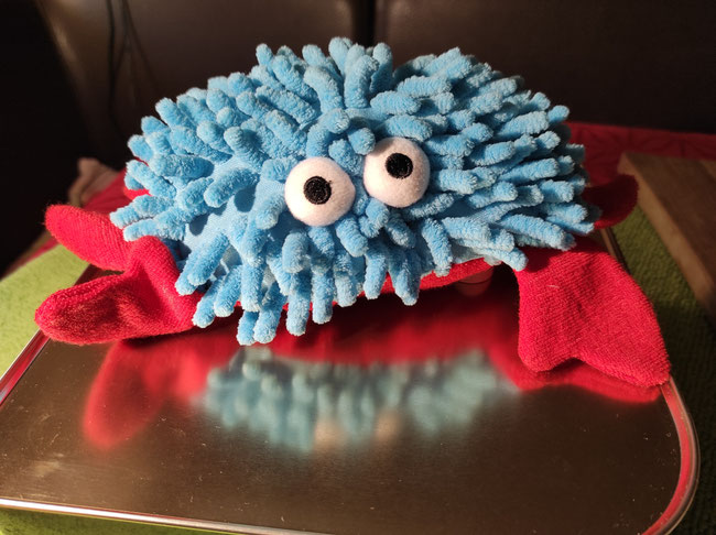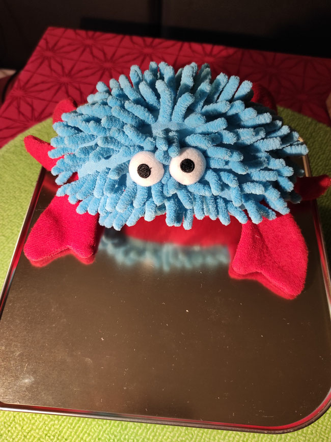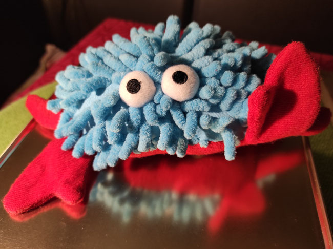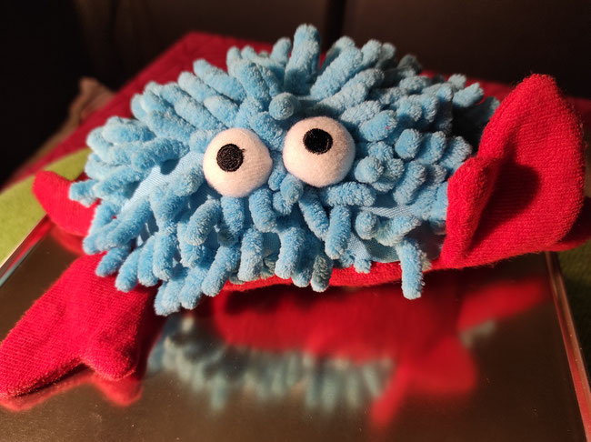 Au au au au au! Heute wollte ich mit Paula auf ihrem Rechen-Rahmen trainieren. Dabei bin ich gestolpert und - plumps - von unsrem blauen Plüsch-Hocker auf die harten Fliesen gefallen, voll auf die Birne! Jetzt habe ich ein Horn zuviel auf dem Kopf. Es tut ganz doll weh. Zum Glück ist mir nicht schwindlig oder übel. Paula ist ganz schnell geflitzt und hat mir einen Waschlappen besorgt. Darin steckt ein Kühlbeutelchen aus unserer Eistruhe.