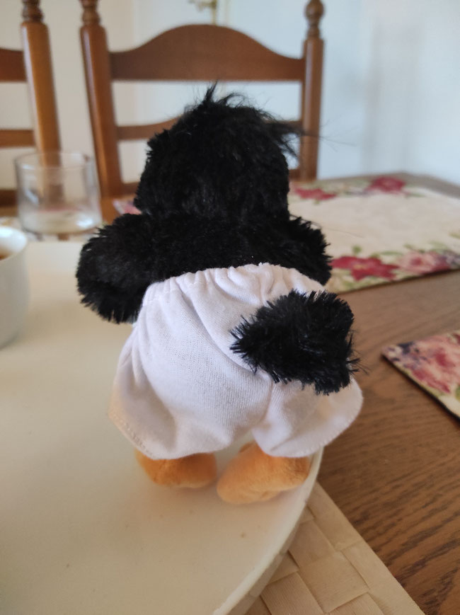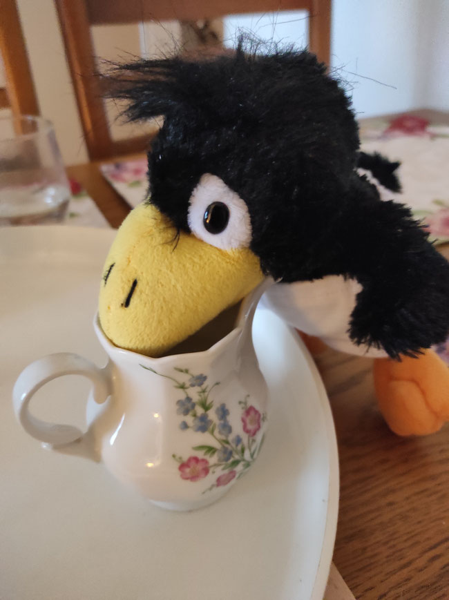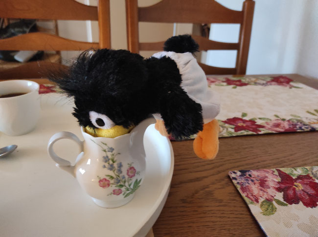Bevor nun die Omi zurück kommt, ziehe ich die Hose wieder richtig an und trinke ich noch ein wenig von ihrer Kaffee-Sahne. Mein langer Schnabel doch wie gemacht für dieses Milch-Kännchen. Njami!