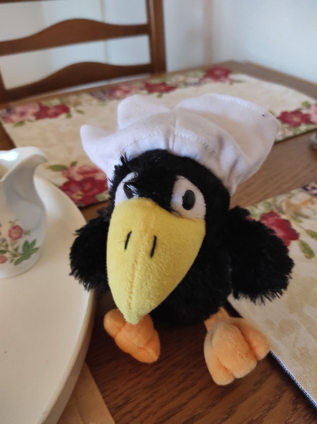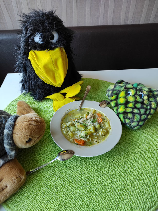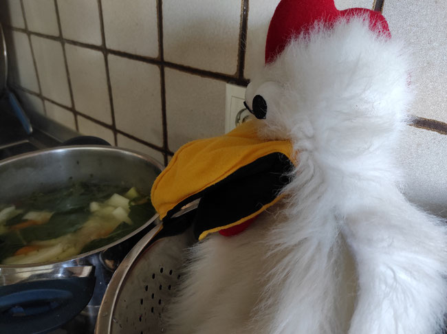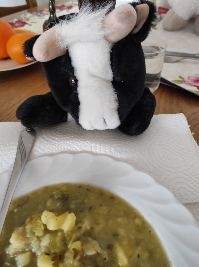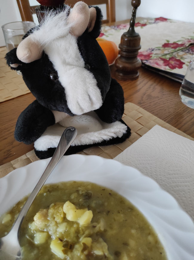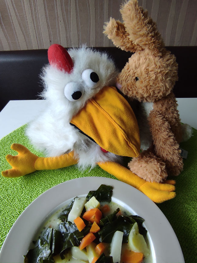 ich bin's nochmal, eure Gundi. Meine Beule ist inzwischen kleiner geworden. Heute soll ich aber nicht mit den Anderen draußen herumturnen, weil es mir noch nicht wieder richtig gut geht. Die Oma passt auf mich auf. Gerade essen wir ihren leckeren Spitzkohl-Eintopf.