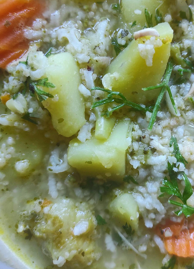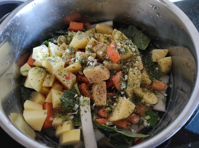 Wir hatten noch kleine Mengen Rosenkohl, Brokkoli, Blumenkohl, Möhren und Kartoffeln in der Küche. Die haben wir einfach mit etwas weißem Reis, Kräutern und einer Hand voll roten Linsen in einen Topf geworfen und gekocht. Ein Schuss Öl von unseren Sonnenblumen, Pfeffer und Salz sind wichtige Zutaten. Odilos grüne Lieblingsgewürze - Kerbel und Liebstöckel - dürfen nicht fehlen!