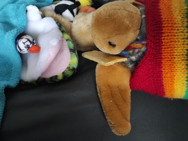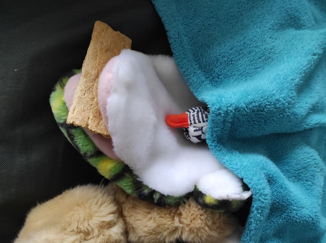 Ohje, Odilo ist mit einem Knabberbrot im Maul eingeschlafen. Ich muss es ihm wegnehmen, damit er sich nicht verschluckt.