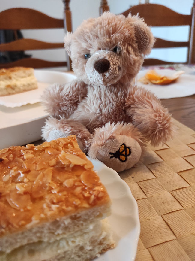 Seht mal, ich habe gerade bei der Omi meinen Lieblingskuchen bekommen. Er heißt eigentlich Bienenstich, aber ich habe ihn Bärli-Stich genannt. Er duftet herrlich nach gold-brauner Brutzel-Butter, nach dem würzigen Honig von unseren Sabbelinchen, nach gebrannten Mandeln und Vanillepudding.