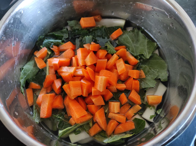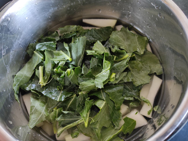 Weil Hilde aber die großen Blätter mitkocht, ist der Topf gleich viel voller!