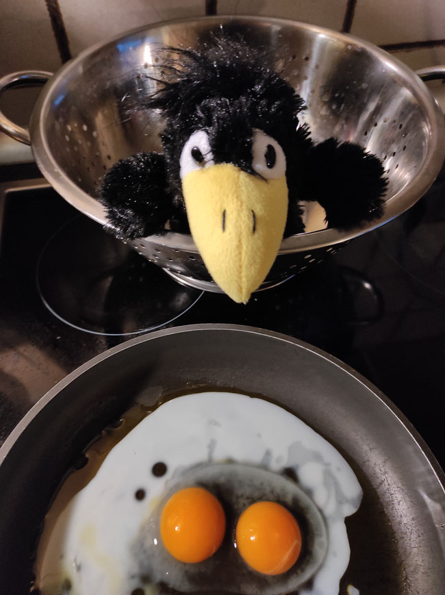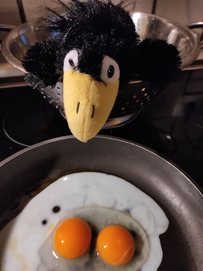 Aber zuerst sehe ich noch in Ruhe zu, wie dieses Doppelei in der Pfanne brät.