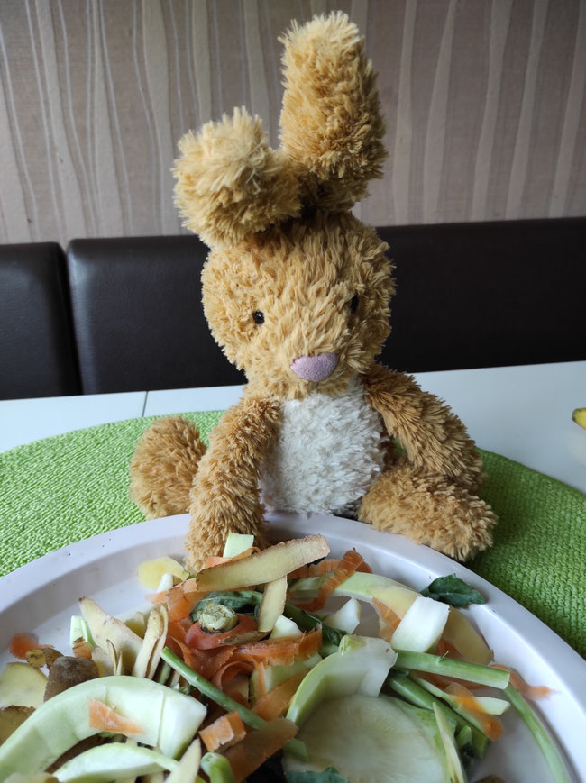 Bei uns wandert nichts in den Müll! Diejenigen von euch, die Kaninchen haben, wissen sicher auch, dass sie gerne Gemüsereste fressen. Kohlrabi-Schalen und Möhrenschalen-Raspel - hm, njami! Nur die Kartoffelschalen werde ich für den Kompost lassen, denn davon bekomme ich manchmal ein bisschen Bauchweh.