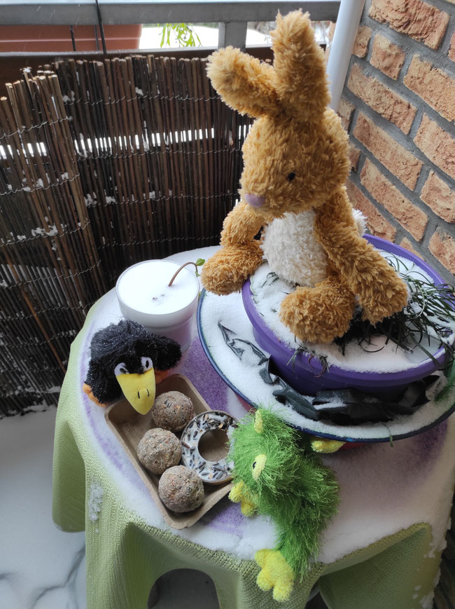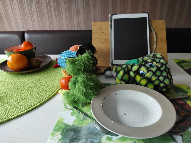 Seht mal, wie sie über den Tisch davonrauschen! Das ist nicht nur Schneegestöber, sondern auch KuTi-Gestöber! Haha! Und das Obst haben sie auch gut abgeräumt! So muss es sein, unsere KuTi-Kids leben gesund!