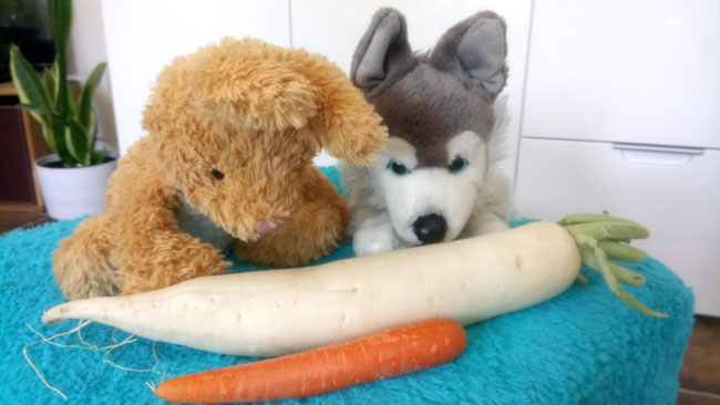 Nun sind Hanno und ich angenehm müde und ruhen uns aus. Ach ja, und wir knabbern das Möhrchen und den Rettich, den wir als Dankeschön von den Leuten bekommen haben!