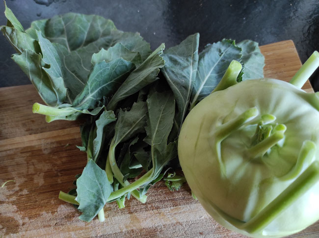 Das Grün vom Kohlrabi kochen wir auch immer mit, und aus Rote-Bete-Blättern machen wir einen Salat!