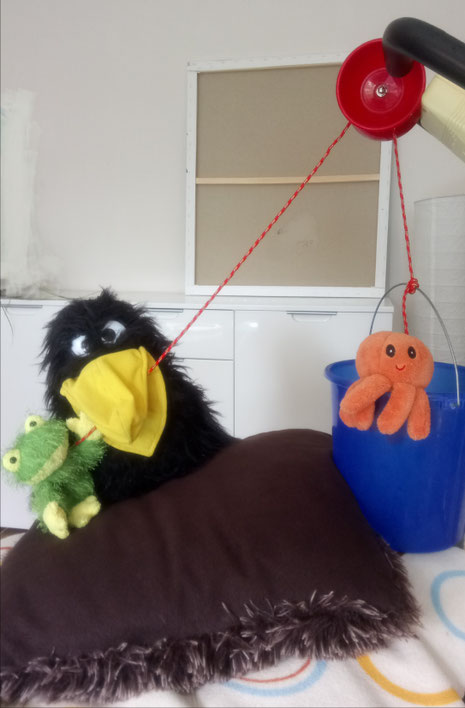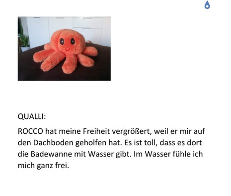 Wenn wir gemeinsam an dem langen Seil ziehen, ist QUALLI mit dem Eimer rucki zucki oben am Fenster und lässt sich direkt in ihre volle Badewanne plumpsen - platsch!