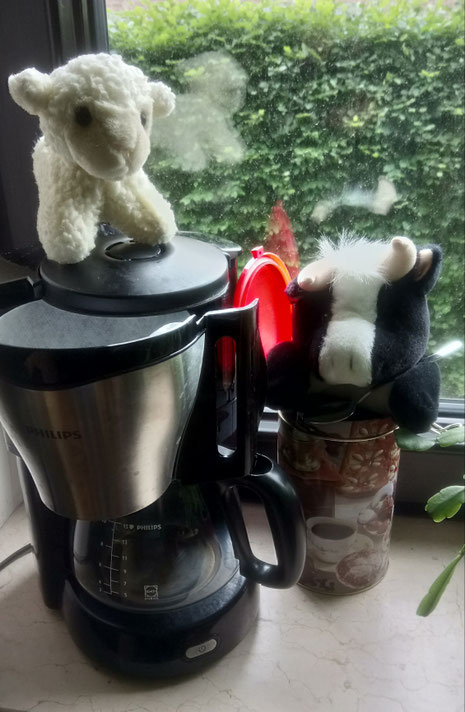 Während unsere Frühaufsteher im Teich plantschen und die anderen noch wach werden, decken wir schonmal den Frühstückstisch. Mit Mama Nicole zusammen essen wir die Reste von unserer Party. Frieda und ich kochen ihr einen duftenden Kaffee. Regenwurmröstis mag die Mama Nicole übrigens nicht. Wollt ihr sie haben Kinder? Kr kr kr!