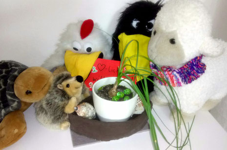 ... ein kleines Geschenk und ein paar sehr hübsche Ostereier nachträglich. Den braunen Übertopf hat ROCCO aus Ton selbst geformt.