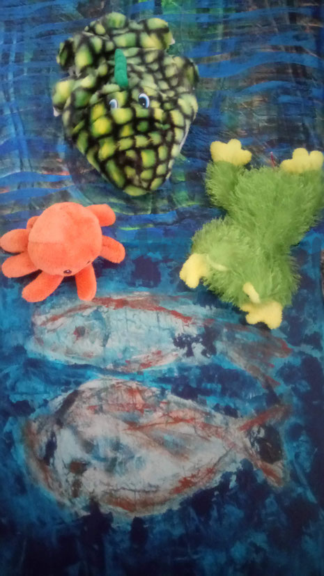 Panzerotti und Paula haben einen Riesenspaß, wenn sie zusammen auf Odilos Rücken durch die Wanne schwimmen, während Qualli und ich ein paar Runden tauchen.