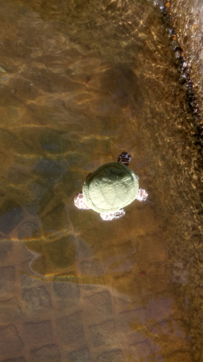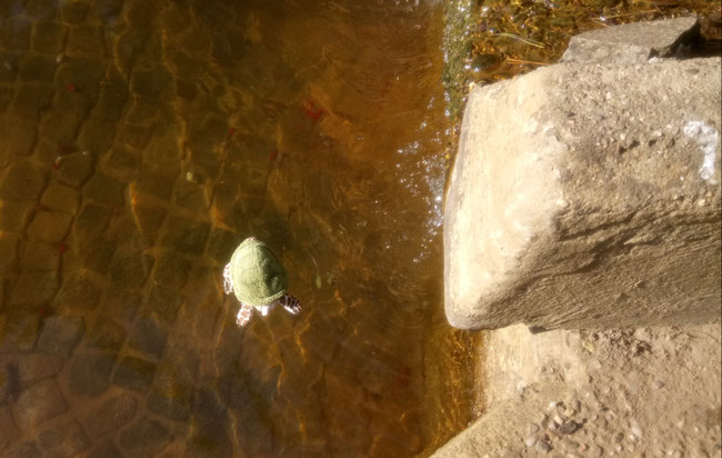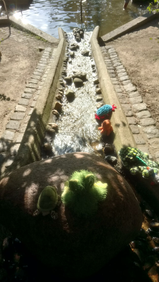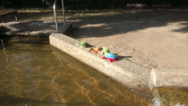 Ihm war es viel zu hoch. Aber nach einer Weile hat er es geschafft, seine Angst zu überwinden und ist einfach ins Wasser gesprungen. Schwimmen und tauchen kann er ja prima. Tief genug ist das Becken auch für uns KuTis. Für euch Kinder ist es viel zu flach, ihr würdet euch beim Sprung in dieses Becken wahrscheinlich verletzen, weil ihr auf den Boden prallt. Macht es uns hier also bitte nicht nach!
