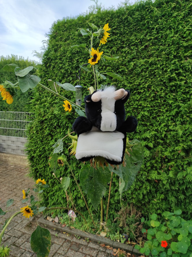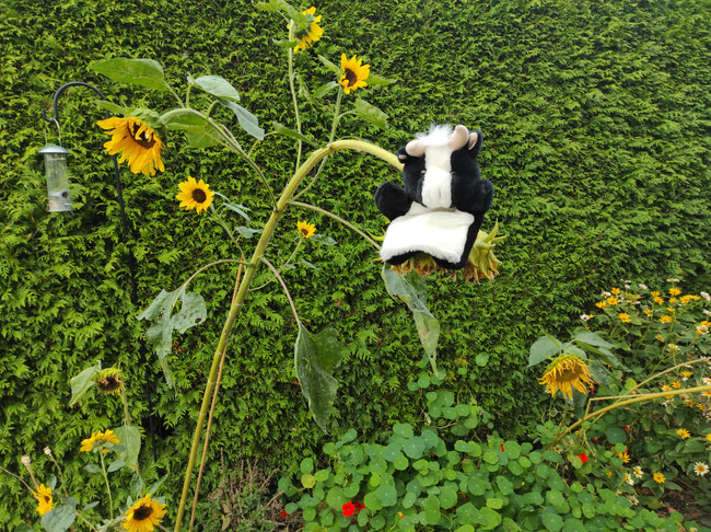 Wie findet ihr meine Sonnenblumen-Abenteuerschaukel? Sie wiegt sich so richtig kräftig mit dem Wind - ganz hoch hinauf und ganz tief hinunter und auch nach links und rechts. Es ist gar nicht so einfach, die Balance zu halten. Fast wäre ich schon einmal herunter gefallen!