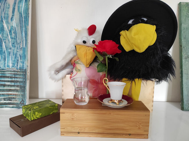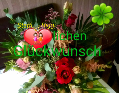 Es ist sehr schön hier! Wir treffen viele Freunde, Freundinnen und Bekannte, die wir lange nicht gesehen haben! Der Saal ist sehr elegant geschmückt und der Kaffee vorzüglich! Gleich werden wir gratulieren und unsere rote Rose mit den beiden Geschenken überreichen. Seht mal, unsere selbstgemachte Karte: