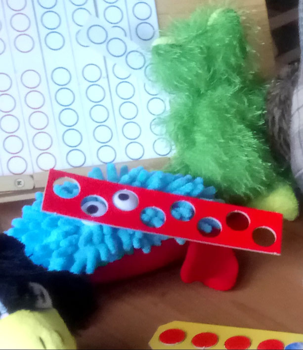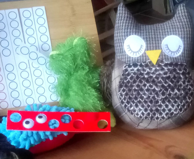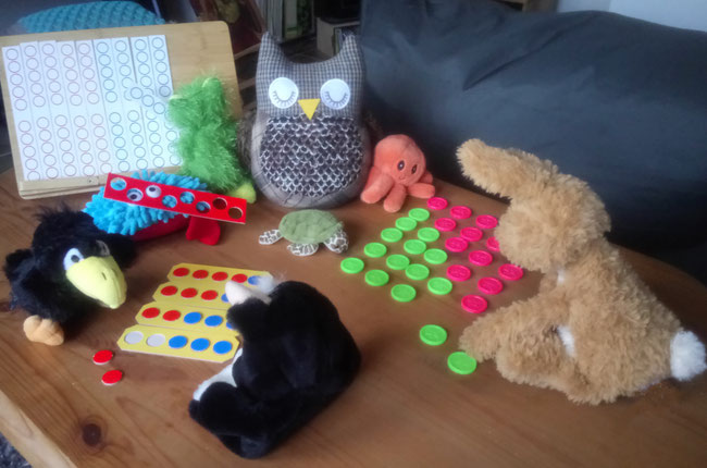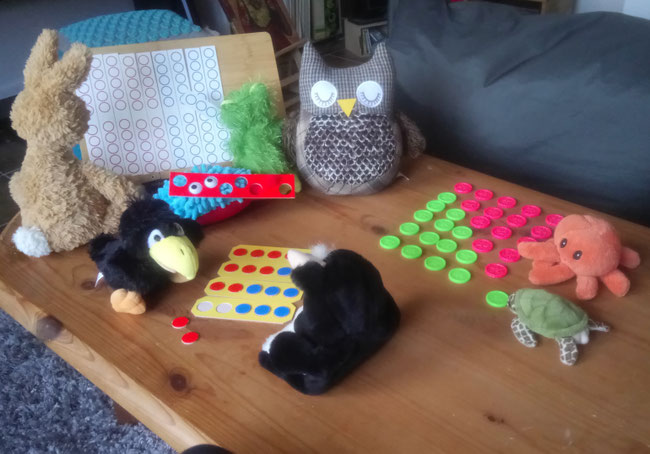 Azzurro war fleißig und hat für uns Zehner-Streifen und Einer-Plättchen aus Pappe ausgeschnitten. Aber auch die Plättchen von unserem Vier-Gewinnt-Spiel benutzen wir zum Arbeiten.