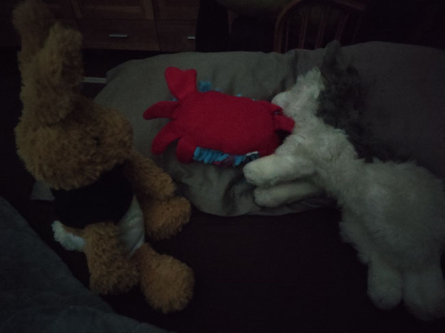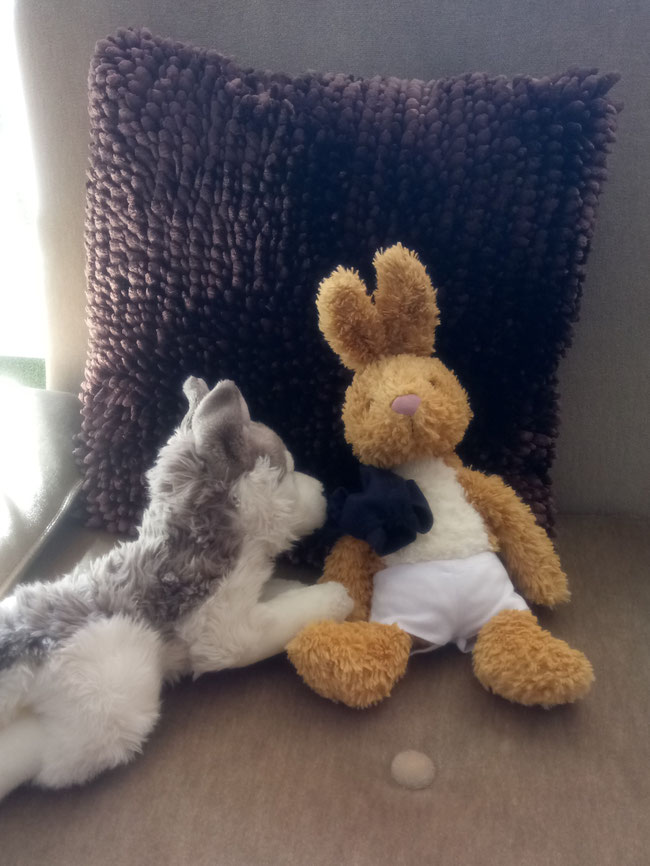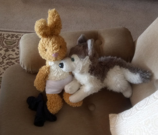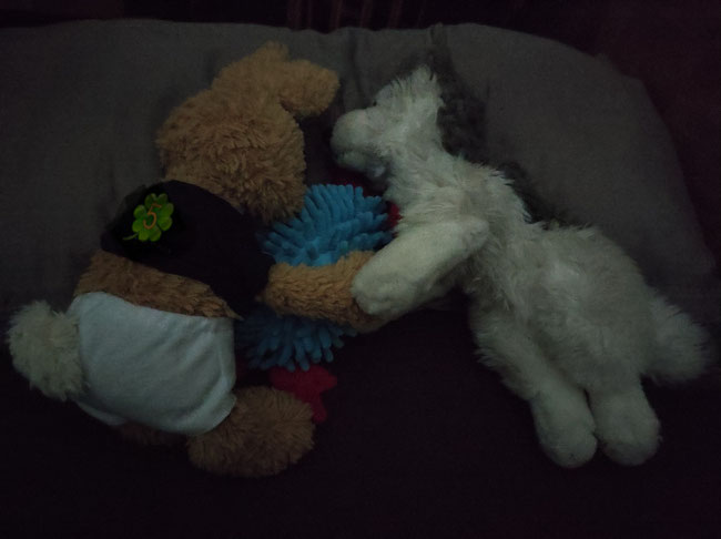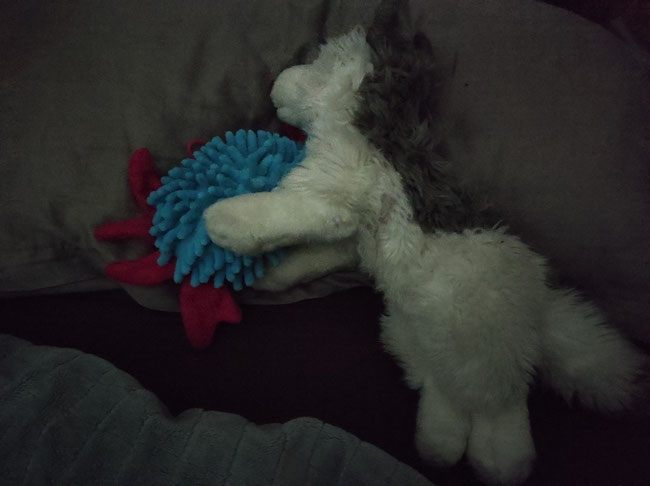 Da war ich froh, dass ich noch wach war, denn so konnte ich ihm helfen. Ich drehte ihn vorsichtig um und legte ihn zwischen Laykas Pfoten. Dann musste ich noch dringend mal Pipi machen. Hinterher habe ich mich an die beiden gekuschelt - so, dass Azzurro sicher auf dem Bauch liegen bleiben konnte. Anschließend bin ich sofort eingeschlafen. Heute morgen ist mir erst aufgefallen, dass ich vergessen hatte, mein Trikot auszuziehen.