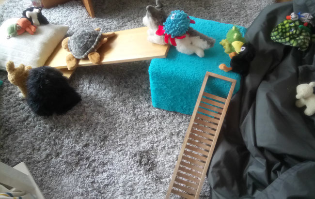 Für Azzurro ist es ein bisschen schwierig, die Leiter hinauf zu klettern. Seitwärts geht es am besten, und mit Laykas und Froschis Hilfe klappt das auf jeden Fall!