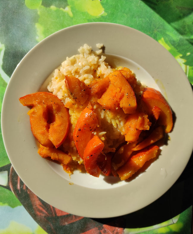Reis mit in gebratenem Kürbis in Orangen-Buttersauce.