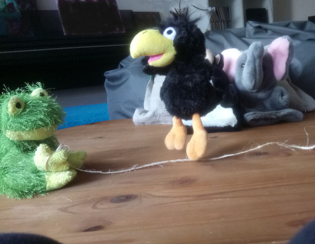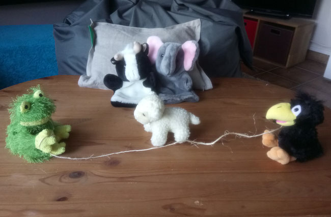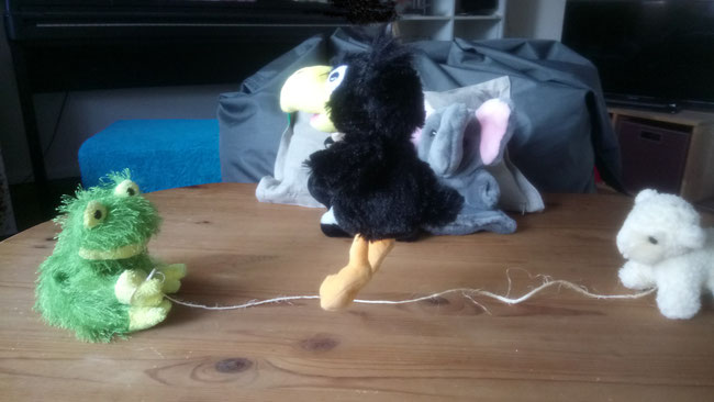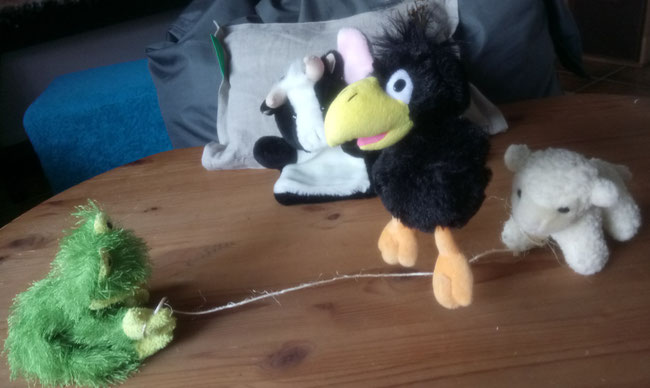 Bei mir klappt es mit dem Springen noch nicht so ganz. Dauernd landet das Seil auf meinem Kopf, weil Toni es noch nicht richtig rund schwingen kann. Er macht mit seinen Flügeln immer Flatterbewegungen - auf und ab. Gut, dass mein Kopf mit viel lockiger Wolle bedeckt ist. Jetzt tauschen wir erst einmal. Hopp, Toni!